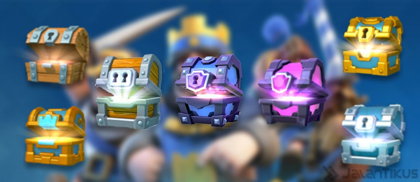 yang terakhir ada 3 chest yang bisa dibilang kesulitan untuk mendapatkannya sangatlah tinggi karena persentasenya dari mulai 10% hingga 0,01%, dari yang persennya besar yaitu GIANT CHEST & MAGICAL CHEST serta dengan persen terkecil SUPER MAGICAL CHEST. waktu yang dibutuhkan GIANT CHEST dan MAGICAL CHEST untuk membukanya ialah 1 hari sedang SUPER MAGICAL CHEST butuh waktu 2 hari namun rewardnya sungguh besar dari GIANT CHEST yang berisi common card dan gold yang banyak sampai SUPER MAGICAL CHEST yang 30% kemungkinan salah satu isinya adalah LEGENDARY CARD. 3 chest ini dapat juga dibeli dengan diamond di shop. sebetulnya selain beberapa chest tersebut ada 1 jenis chest lagi yaitu tournament chest namun kalian minimal haruslah level 8 untuk bisa masuk ke tournament jadi bagi pemula sepertinya butuh waktu untuk masuk kedalam sistem ini. satu hal yang paling penting adalah kalian hanya dapat menyimpan 4 chest yang kalian dapat ketika menang jadi kalian tidak akan mendapat chest ketika chest nya penuh maka dari itu kalian dapat bermain ketika chest sudah terbuka dan menunggu hinga chest terbuka lagi. namun kalian dapat tetap bermain karena dengan bermain kalian dapat menaikkan crown kalian untuk naik arena ataupun mendapat gold dari menang namun terbatas 20 kali kemenangan perhari untuk gold .
